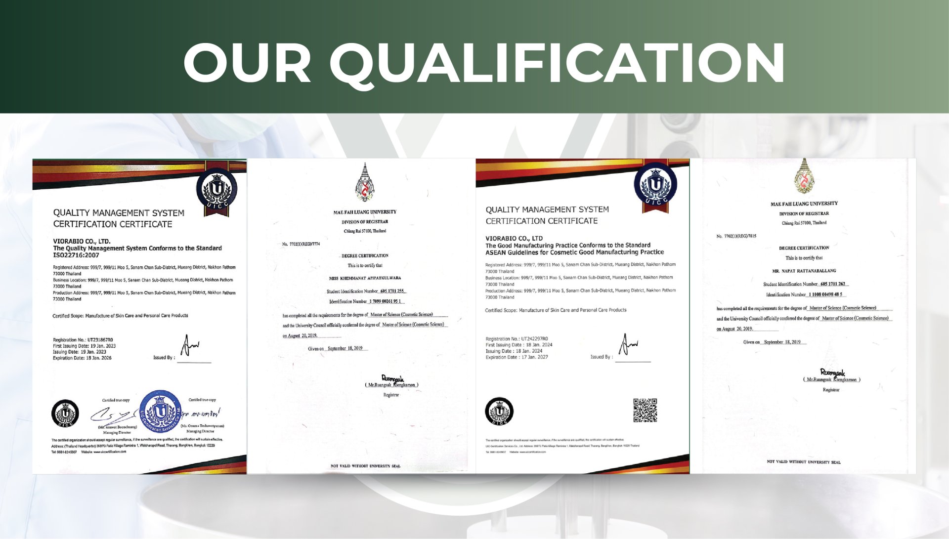 บริษัท วิโอร่าไบโอ จำกัด ด้วยประสบการณ์ด้านการผลิต คิดค้น และวิจัยสูตร เครื่องสำอางมากว่า 10 ปี ทั้งยังมีประธานและผู้บริหาร จบการศึกษามหาบัณฑิต สาขาวิทยาศาสตร์เครื่องสำอางโดยตรง จึงมั่นใจได้ว่าทุกผลิตภัณฑ์ผ่านการคิดค้นวิจัยสูตรโดยผู้เชี่ยวชาญอย่างมืออาชีพ ผ่านการทดสอบ และการใช้จริงก่อนแจกจ่าย เราผลิตภายใต้แนวคิดที่ว่า " ขายดีอยู่ที่การตลาด แต่ซื้อซ้ำอยู่ที่คุณภาพของผลิตภัณฑ์ " เราใส่ใจและให้สำคัญในการสร้างผลิตภัณฑ์ที่ดีได้มาตรฐานผ่านการทดสอบและได้ผลลัพธ์ เพื่อให้ผู้ใช้ประทับใจมากที่สุด